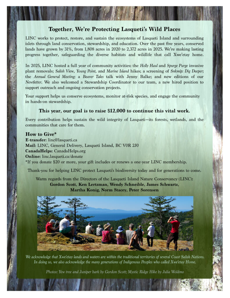 As the year draws to a close, we’re reminded of how deeply the generosity of Lasqueti Islanders sustains the work of the Lasqueti Island Nature Conservancy. Your support enables us to restore biodiversity, protect ecosystems, and share ecological knowledge with our community. We truly couldn’t do this work without you.
